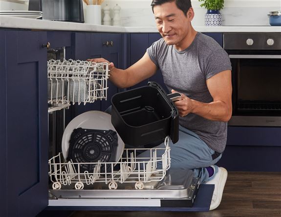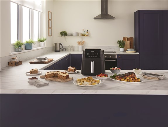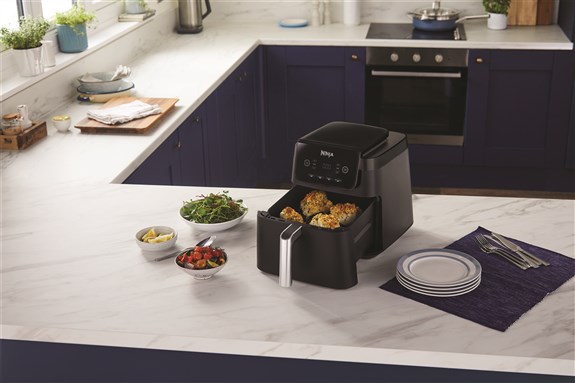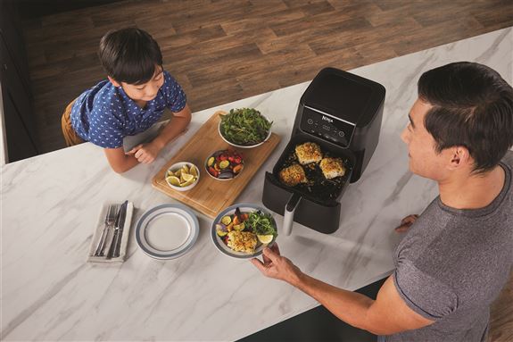Con 2 cajones apilados, la freidora de aire 6 en 1 vertical Max 9,5L, ahorra espacio, sin comprometer su capacidad. Perfecta, tanto para cocinas pequeñas como para familias numerosas. Puede asar un pollo entero de 2 Kg o hasta 1,4kg de patatas fritas en cada cajón de 4,75L, puede apilar alimentos usando las rejillas incluidas para duplicar la capacidad y cocinar 4 alimentos al mismo tiempo. Perfecta para 1 o más de 8 comensales. Más que una freidora de aire ya que combina 6 funciones de cocción: Air Fry, Max Crisp, Asar, Hornear, Deshidratar y Recalentar. También cuenta con la función SYNC & MATCH, te permite ajustar tiempo, temperatura y el programa diferente en cada cajón y ambos estarán listos al mismo tiempo! Cocine hasta un 55% más rápido que los hornos de ventilador, consumiendo menos energía3 y hasta un 75% menos de grasa1 utilizando la función Air Fry. Panel de control digital, fácil de usar, con temporizador para ver cuánto tiempo queda de cocción. Con innovadores ventiladores traseros que garantizan que los alimentos se cocinen uniformemente y queden crujientes en todos los niveles. Esta freidora de aire doble incluye guía de recetas y es fácil de limpiar, con cajones y placas antiadherentes aptos para lavavajillas. Haga de la suya una cocina Ninja.